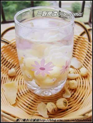 [做法] 百合浸水一夜后,冲洗干净。莲子浸泡4小时,冲洗干净。将百合、莲子置入清水锅内,武火煮沸后,加入冰糖,改文火续煮40分钟即可食用。