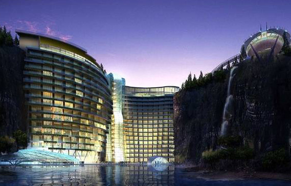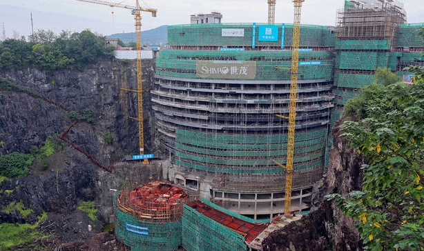 “深坑酒店”位于上海松江国家风景区佘山脚下,是一座深达80米的废弃大坑,该深坑原系采石场,经过几十年的采石,形成一个周长千米、深百米的深坑。