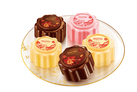 5、在冰淇淋表面淋上巧克力液封口,再冷冻至硬。轻推果冻模底部将成型的冰淇淋月饼取出,放在密封的盒子里保存即可。