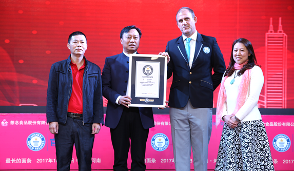 “整整十年,都没有人能真正打破最长面条吉尼斯世界纪录,可想而知挑战这项纪录有多难。但是这次想念食品不仅成功打破了这一纪录,而且将纪录定格在了3048.32米,这太不可思议了。我预计未来很长一段时间内,都不会有人能打破这一纪录,恭喜想念食品!”John Garland在颁发证书时讲道。