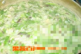 2、 锅内放入肉末、粥、高汤(猪肉汤),再加入胡萝卜泥、青菜泥,小火炖开后;