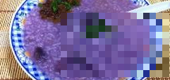 煮稀烂的香热紫粥舀入盘子里配咖哩猪肉碎佐料和少许葱花。