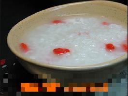 4.将枸杞、粳米加入菟丝子汁中,先用旺火煮沸,再改用小火熬煮,煮至粳米熟软,加入白糖调味,稍煮片刻即成。