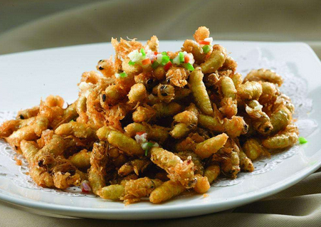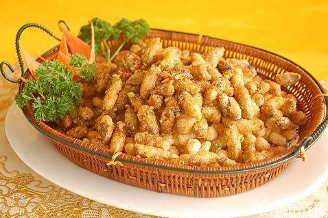 2、往烧至七八成熟的油锅中倒入油,然后倒入蜂蛹,用文火把蜂蛹煎烽至金黄色;