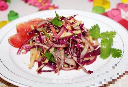 紫洋葱做蔬菜沙拉吃最有功效,在做的时候需要把新鲜的紫洋葱洗净以后,切成薄片放在沸水中焯,1~2分钟去除以后控掉水分,放在干净的容器中,再加入适量的生菜,淋上适量沙拉酱和橄榄油,调匀后就能吃。