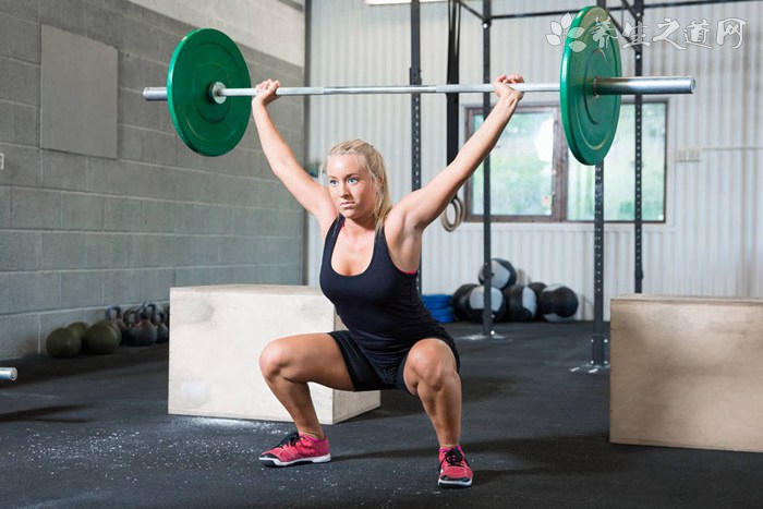 杠铃臀桥--铃片臀桥的升级版:身体平躺在垫上,将杠铃滚到训练者的髂骨上方,屈膝成90度,两脚掌平踏于垫面,双手牢牢握住杠铃杆,握距宽余肩宽。收紧臀部并腰部上挺,可用两个髂前上棘卡住杠铃杆使其被顶起,身体成一条直线,在最高点默数到5,再慢慢放下,记作一次动作。建议杠铃杆中段缠绕海绵泡沫以减小杠铃杆对身体的压强。