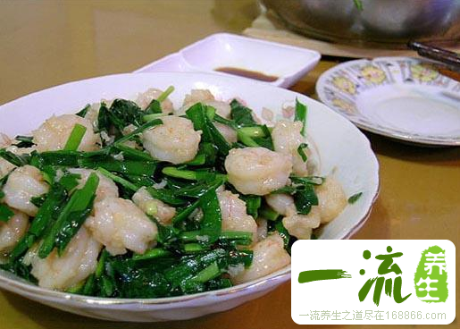 每次用韭菜150克、鲜虾250克去壳,加油急火共炒,熟后,加盐调味食用,每天1次。有补虚助阳,固泄等功效。可适用于治疗盗汗、阳萎、遗尿、遗精等疾患。