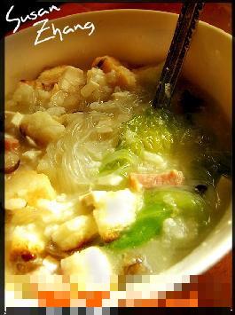 1.在普通的大米粥中加入粉丝火腿木耳。
